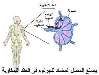 وتأتي بها إلى مراكز تصنيع المصل المضاد؛ أي إلى معامل الدفاع، هذه فرقة، مهمتها الأولى استطلاع المعلومات، الفرقة الثانية مهمتها تصنيع السلاح، هذه موجودة في العقد اللمفاوية، والإنسان عنده عدد كبير من العقد اللمفاوية، في هذه العُقَد يُصنَّع المصل المضاد للجراثيم،
