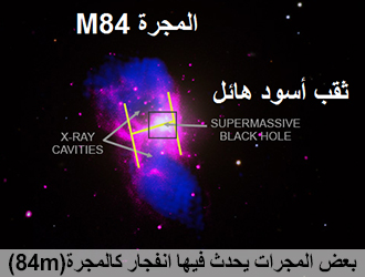 والمجرات والنجوم تأخذ أرقاماً وحروفاً، فهذه المجرة التي رمزها (84m) يحدث فيها انفجار وهذا الانفجار يعادل قوة انفجار قنبلة هدروجينية مضروبة بواحد أمامه ستة وأربعون صفراً، والآن تكلمنا قبل قليل عن الرقم المذهل (مليون مليون) واحد أمامه اثنا عشر صفراً، فإذا كان واحد وأمامه ستة وأربعون صفراً ضعف انفجار القنبلة الهدروجينية؛ هذا انفجار يحدث في مجرة اسمها (84m).