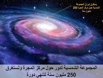 نحن قبل قليل قلنا إن الأرض تمشي ثلاثين كيلو متر في الثانية، من نصف ساعة للآن ثلاثون دقيقة، فثلاثون في ستين ثانية؛ أي ألف وثمانمئة ثانية وبكل ثانية ثلاثون كيلو متر فنكون قد قطعنا مسافة في الفضاء تقدَّر بأربعة وخمسين ألف كيلو متر وهذه سرعة الأرض حول الشمس، فما قولكم في سرعة المجموعة الشمسية حول مركز المجرة؟ مئتان وخمسون كيلو متر في الثانية وهي سرعة المجموعة الشمسية حول مركز المجرة، فكم تستغرق المجموعة الشمسية في دورانها حول مركز المجرة حتى تصل إلى ما كانت عليه قبل كذا سنة؟ قال: مئتان وخمسون مليون سنة تستغرقها المجموعة الشمسية في دورانها حول مركز المجرة، فما سرعة بعض المجرات؟ قال: سرعة بعض المجرات تقترب من سرعة الضوء؛ أي حوالي مئتين وأربعين ألف كيلو متر في الثانية، الأرض ثلاثون كيلو متر، والمجموعة الشمسية مئتان وخمسون كيلو متر، وبعض المجرات الضخمة سرعتها مئتان وأربعون ألف كيلو متر في الثانية، فلو أن الشيء سار بسرعة الضوء لانقلب ضوءً- لصار ضوءًا-،