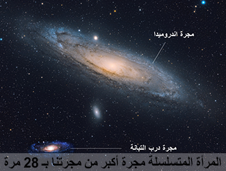 مجرَّتنا إحدى مجرَّات الكون، فيها ما يقترب من مئة ألف مليون نجم، في الكون ما يقترب من مئة ألف مليون مجرَّة، وفي كل مجرة ما يقترب من مئة ألف مليون نجم، المرأة المسلسلة مجرة، حجمها يزيد عن حجم مجرَّتنا بثمانية وعشرين ضعفاً، تبدو نجماً واحداً من عندنا، قد تجدون في السماء نجماً متألقاً يومض، الذي يومض هو مجرة، وبُعدُه عنا مليونا سنة ضوئية، أحدث رقم لمجرة تبعُد عنا عشرين مليار سنة ضوئية،