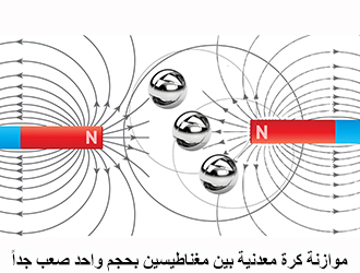 أغلب الظن أن هذا فوق طاقة البشر، أن يضع كرةً حديديةً بين كتلتين مغناطيسيتين بحجمٍ واحد، وقوة شحنٍ واحدة، لا يستطيع، لو جعلنا كل كتلةٍ بحجم معيّن لاحتاجت إلى حسابات رياضية معقدة جداً، لأن قوة الجذب تتناسب مع الحجم، مع مربع المسافة، لو أعطيناه ثلاث كُتَل متفرقة، كل كتلة بحجم، أصعب وأصعب، لو أعطيناه أربع كتل، أما كتلتان على سطح وكتلتان في الفراغ فأصعب وأصعب، لو أعطيناه كتلاً عديدةً مختلفة الحجم وهي تتحرَّك في فضاء، وضع هذه الكرة في مكانٍ متوسط بحيث لا تنجذب لا إلى هنا ولا إلى هنا، هذا فوق طاقة البشر، وهذا هو الكون، الكون مئة ألف مليون مجرة مع مئة ألف مليون نجم، كلها بأحجام كبيرة، وصغيرة، ومتفاوتة، وكثافات متفاوتة، وهي كلها متحرِّكة، والمحصلة نظام مستقر، توازن حركي، هذا معنى قوله تعالى: