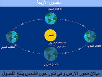 ونظام الفصول أساسه دورة الأرض حول الشمس مع محورٍ مائل،