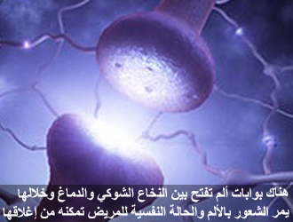 بالدماغ مكان الإحساس بالألم، وطريق الآلام يبدأ من النهايات العصبية, إلى النخاع الشوكي, إلى الدماغ، قال: على هذا الطريق بوابات هذه تغلق أحياناً، فإذا أغلقت الألم هبط إلى العشر، هذه البوابات تتحكم بها الحالة النفسية للمريض، المؤمن تسعون بالمئة من آلام المرض تذهب عنه، تغلق البوابات، يصل من الألم النذر اليسير، أما إذا كان غير مؤمن البوابات مفتوحة، -هكذا قرأت في بحث علمي-، تتحكم بها الحالة النفسية للمريض، المريض المؤمن صابر بالضراء، وشاكر بالسراء، وفي الحالتين يكسب شيئاً كثيراً.