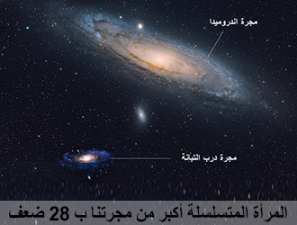 وتبدو في المناظير نجماً واحداً كلها، كل شيء ترونه في السماء هو درب التبانة، مجرتنا فقط، يوجد نجم متألِّق جداً اسمه المرأة المُسلسلة، هو في الحقيقة مجرةٌ بأكملها، ويزيد حجمها عن حجم مجرتنا بثمانيةٍ وعشرين ضعفاً،