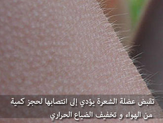 شيءٌ آخر، يواجه الإنسان البرد بآلية أُخرى، فهناك في رأس الإنسان ما يزيد عن مئتين وخمسين ألف شعرة، تزيد أو تنقص، لكلِّ شعرةٍ؛ وريدٌ، وشريانٌ، وعصبٌ، وعضلةٌ، وغدةٌ دهنية، وغدةٌ صبغية، فإذا برد الإنسان يأتي أمرٌ إلى الأشعار فتنتصب، وإذا انتصبت، حجزت كميةً من الهواء الساخن أكثر من ذي قبل .