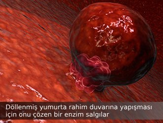 Orada başka bir sistem devreye girer. Elektron mikroskobu ile yakalan bu görüntüde döllenmiş yumurtanın rahime ulaştığı andan anne rahmine geldiği ana kadar olan yolculuk görünmektedir. Yumurtanın dış yüzeyindeki hücreler rahim duvarını eriten özel enzimler salgılar ve böylece döllenen yumurta rahime sıkıca yapışır.